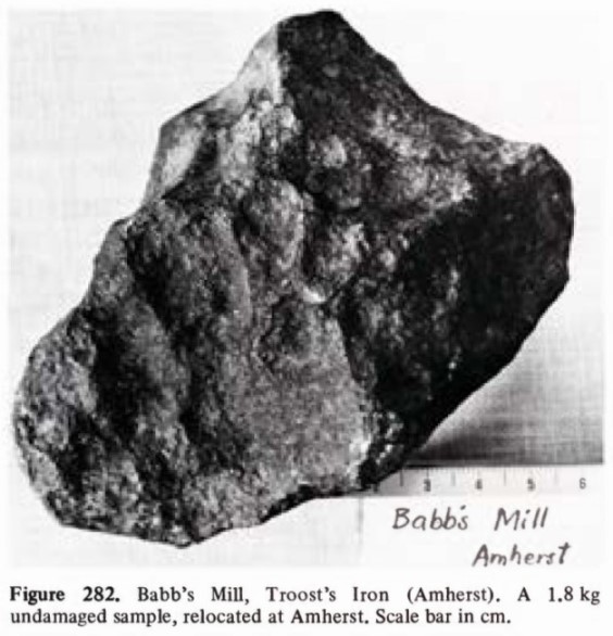 Babb's Mill (Troost's) iron is classified as an ungrouped nickel-rich (17.5%) ataxite. Although the 6 kg mass has been artificially heated, the 2.7 kg mass is undamaged. According to the 'Handbook of Iron Meteorites' (V. Buchwald, vol. 2, p. 286; photo), a 1.857 kg section from the 2.7 kg mass was included as part of the Shepard collection sold to Amherst College, Massachusetts. The 1.857 kg section was subsequently acquired by the Buseck Center for Meteorite Studies, Arizona State University in Tempe (see photo below).