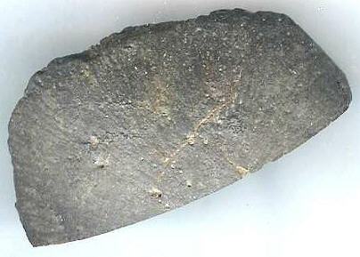 The specimen of Eagles Nest shown above is a 1.2 g fusion-crusted partial slice (photo courtesy of K. Regelman). The top photo below shows a complete slice of Eagles Nest, while the bottom photo shows a small preserved portion of the oriented face of this meteorite exhibiting radial flowlines.