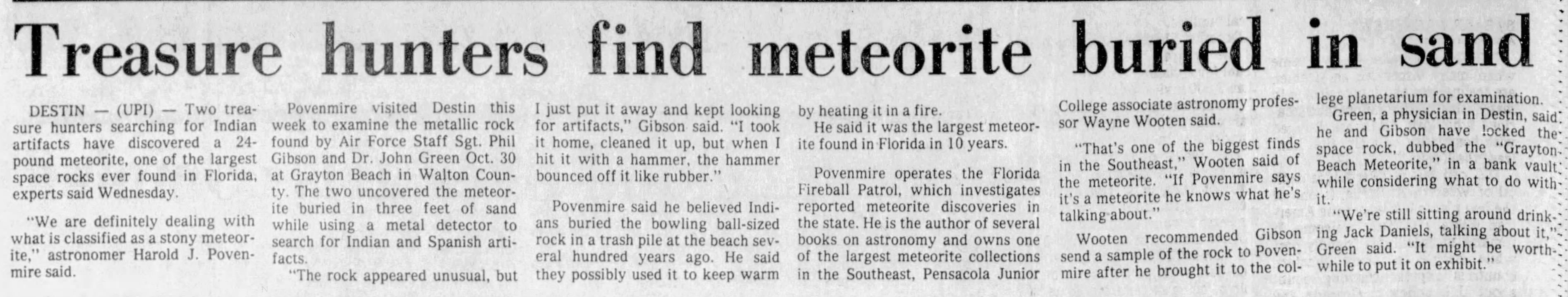 An article reporting on the circumstances surrounding the discovery of the Grayton meteorite, "Treasure-hunters unearth meteorite", by Brian Doyle, was published in the 'Northwest Florida Daily News' in 1983. In November 2013, "Grayton's meteoric moment: 30 years later, resident recalls discovery" was published by Jennie McKeon in 'The Walton Sun', which includes an interview with Phil Gibson, one of the original finders of the Grayton meteorite. The article shown below was published in 'The Miami Herald' November 17, 1983.