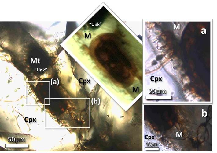 It is notable that the MIL nakhlites contain melt inclusions within clinopyroxene with a trapped chlorine-rich fluid along with its reaction product, potassic-chlorohastingsite (McCubbin et al., 2009). Successive oxidation of this fluid and its reaction with pyrrhotite led to acidification and subsequent formation of jarosite and hematite upon cooling below ~200°C. Unlike Nakhla, the MIL pairing group did not experience significant shock disturbance since its crystallization. Fracture-free (type Ia) melt inclusions trapped within augite cores could record the Nakhla primary magma composition (Sautter et al., 2012).