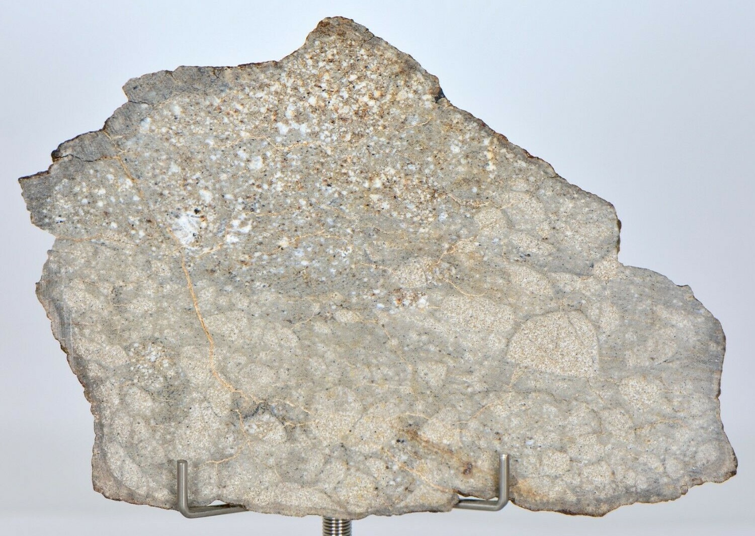 Minor and trace element analyses along with Mn–Cr, Sm–Nd, and Lu–Hf isotopic analyses were conducted by Guo et al. (2019) for NWA 12338; results from their investigation are forthcoming. Further information about the anomalous eucrite-like meteorites and their proposed origin from multiple distinct parent bodies can be found on the Pasamonte page. The specimen of NWA 12338 shown above is a 2.67 g part slice, while that below is a 17.55 full slice with brecciation shown courtesy of Dustin Dickens.
