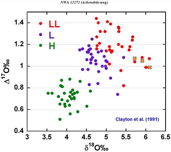 Vaci et al. (2018) identified several ungrouped igneous achondrites with oxygen isotopic affinities to L and LL chondrites which they designated "supra-TFL achondrites" (see diagram below). The MetBull shows that Northwest Africa 13272 has an O-isotopic signature similar to several ungrouped achondrites including NWA 11575 and NWA 12628, as well as to the ungrouped metal-rich chondrite NWA 12379. Some of these meteorites could represent previously unidentified parent bodies distinct from the OC parent bodies (H, L, and LL) that formed within a common isotopic reservoir in the inner Solar System.
