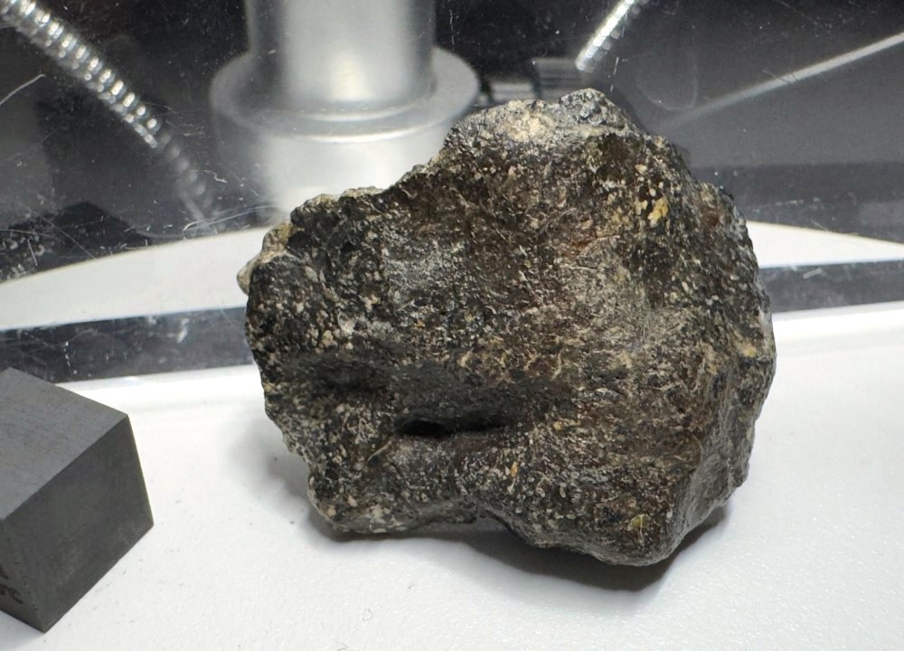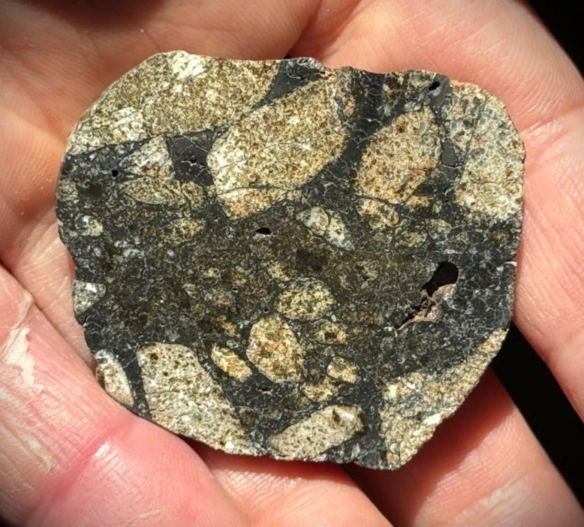 Further information about the anomalous eucrite-like meteorites and their proposed origin from multiple distinct parent bodies can be found on the Pasamonte page. The specimen of NWA 13921 shown above is a 13.75 g end section acquired from the Lyon Bros. The photo below shows a 39.7 g complete slice with both melted and unmelted phases.