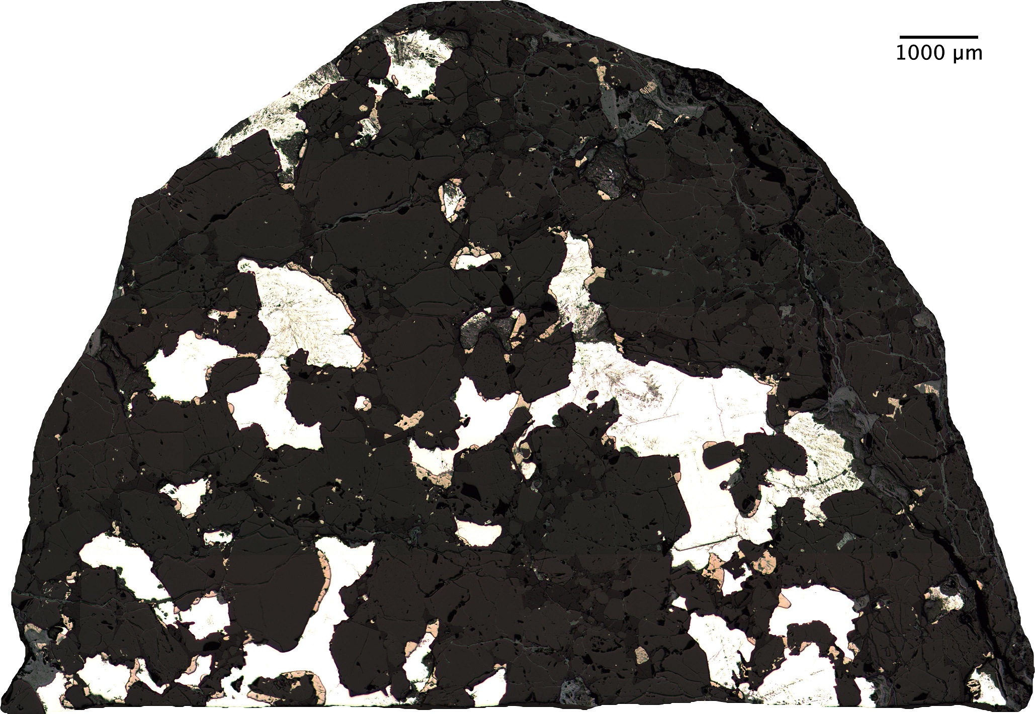 Northwest Africa 14500 has a coarse granoblastic texture consisting of millimetric orthopyroxene and olivine grains (63 vol%), smaller albitic alkali feldspar grains (15 vol% [An0.0 (±0.0), Ab95.0 (±0.2), Or5.0 (±0.2)]), irregular-shaped FeNi-metal (20 vol%), troilite (3.5 vol%), and accessory chromite (J. Gattacceca, MetBull 111). Both sides of a 3.20 g slice of NWA 14500 are shown above and at the top below, photographed by Fabien Kuntz. The high-resolution photo shown below is part of the Meteoritical Bulletin Database write-up by J. Gattacceca.