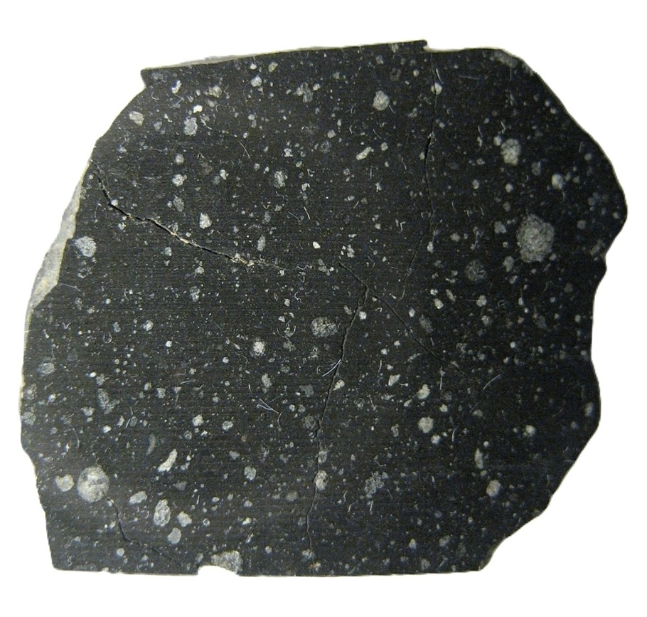 The photo of NWA 16000 shown above is a 3.05 g slice, shown courtesy of F. Kuntz. The meteorite exhibits the typical features of this unique carbonaceous chondrite as demonstrated in the photo of multiple slices below.