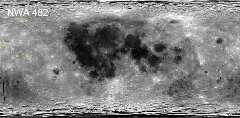 Calzada-Diaz et al. (2015) compared compositional and age data from a large number of lunar meteorites with elemental remote sensing data obtained by the Lunar Prospector gamma ray spectrometer, primarily for Fe, Ti, and Th, to better constrain the meteorite's source regions. For the crystalline impact-melt breccia NWA 482, plausible ejection sites were identified in the Feldspathic Highland Terrane on the farside (see image below).