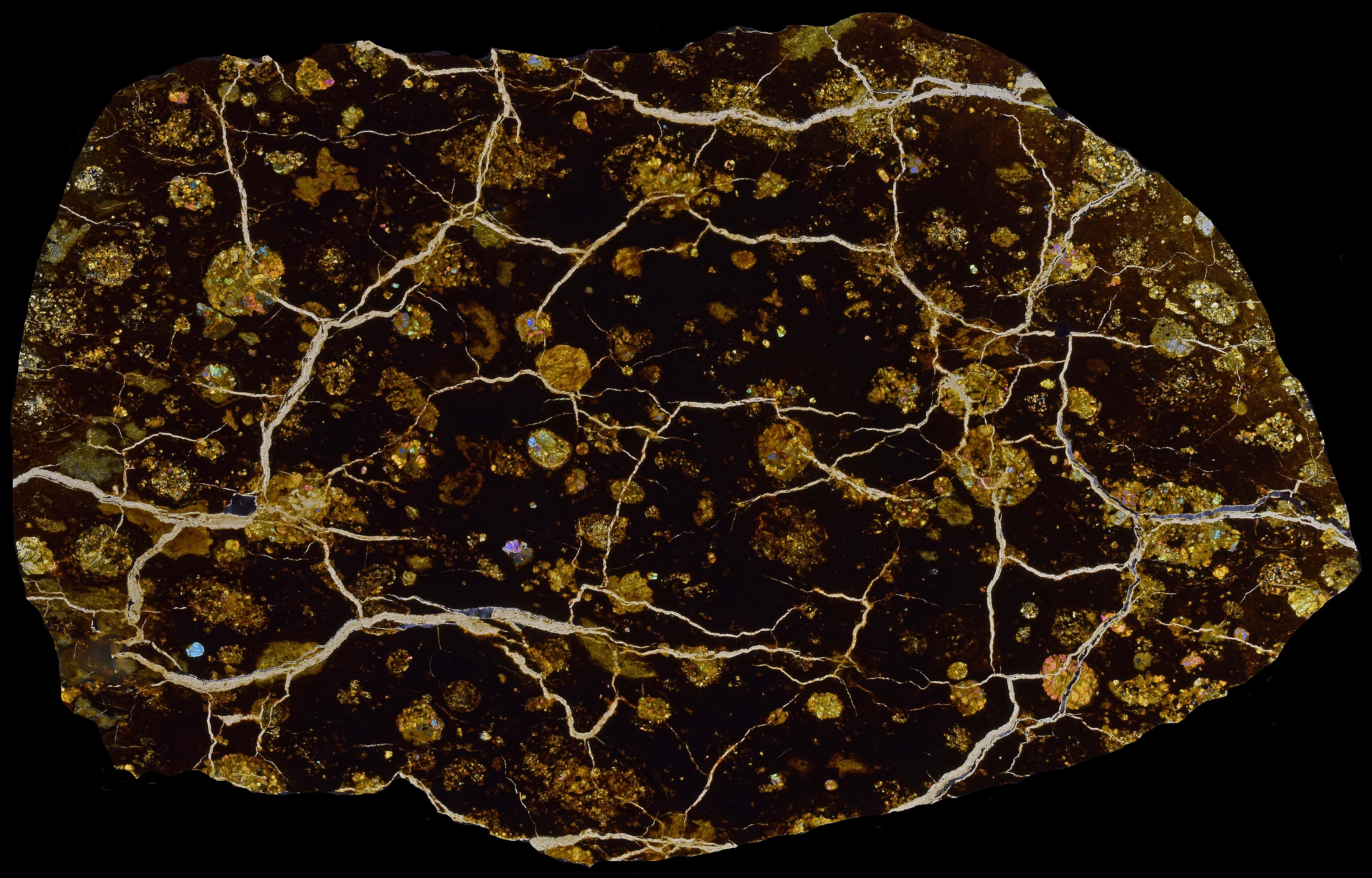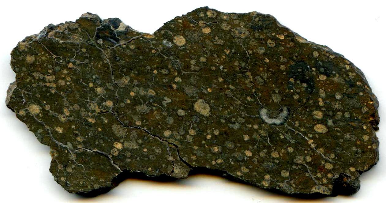 The photo of NWA 6047 shown above is a 6.92 g slice measuring 5 cm across with a small portion of a CAI visible. The photos below show a nice slice of NWA 6047 in the collection of Stephan Kambach, along with a photo of the main mass. The bottom image is an excellent petrographic thin section micrograph of NWA 6047 shown courtesy of Peter Marmet.