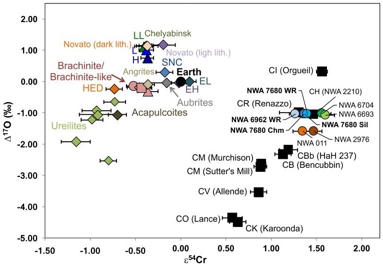 Further studies have been conducted by Sanborn et al. (2018) of new anomalous ungrouped meteorites recovered in Northwest Africa. Utilizing a coupled Δ17O vs. ε54Cr diagram, they demonstrated that NWA 6704 and pairings, NWA 011 and pairings, and NWA 6962/7680 all plot within the CR/CH carbonaceous chondrite field represented by CR2 Renazzo and CH3 NWA 2210, which suggests a possible genetic linkage among them (see diagram below).