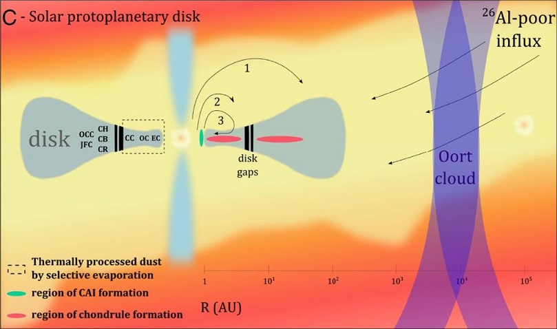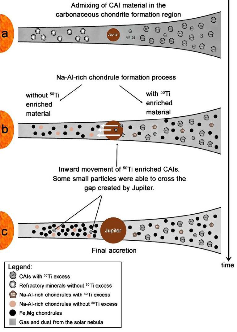 Ebert et al. (2018) investigated the Ti isotope systematics of CAIs and Na–Al-rich chondrules from ordinary and CO chondrites. CAIs from both of these chondrite groups show the presence of nucleosynthetic anomalies, such as an average excess in ε50Ti of ~9. On the other hand, although Na–Al-rich chondrules in the CO chondrites studied have a ε50Ti excess, those from the ordinary chondrites do not. Given that Na–Al-rich chondrules from both CO and ordinary chondrites are considered to have incorporated refractory components (~30–80% CAIs and/or AOAs), they reason that the refractory material precursor to ordinary chondrules did not have a ε50Ti excess, and thus was different from the refractory material admixed to form CO chondrules. They contend that this difference may be due to the specific formation region of the respective precursor refractory material: either in the non-carbonaceous (NC) region within the inner Solar System (ordinary chondrites), or in the carbonaceous (CC) region beyond Jupiter (CO chondrites). They propose that the rare CAIs with ε50Ti excesses which are present in ordinary chondrites could represent the smaller-sized CAIs (<150 µm) that were able to migrate across Jupiter's gap in the protoplanetary disk (see diagram below).
