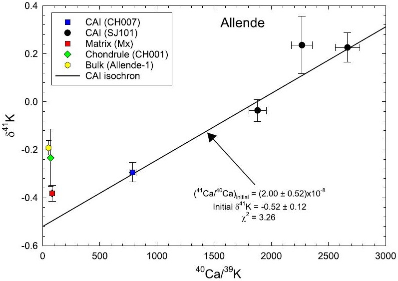 Employing MC-ICP-MS technology, Ku et al. (2022) obtained high precision 41Ca–41K chronometry and established a new Allende bulk CAI isochron. They determined that the initial ratios in the protoplanetary disk for 26Al/27Al (5.23 [±0.13] × 10–5) and 41Ca/40Ca (2.00 [±0.52] × 10–8) were both enriched by about three orders of magnitude over that of the protosolar molecular cloud (1.1 × 10–8 and 4 × 10–11, respectively). Their results attest to a late injection of short-lived radionuclides into the protosolar molecular cloud from a likely common stellar source (26Al is synthesized during the core H-burning phase when 25Mg gains a proton); this event may be associated with the initial collapse of the molecular cloud leading to formation of the Solar System. The type of stellar object involved depends on the exact timing of the radionuclide injection, and given that Type II supernovae are excluded as a potential source due to incompatible 60Fe systematics, the injection is constrained to between 0.6 m.y. (winds from a 60 M⊙ Wolf–Rayet star) and 1.1 m.y. (ejecta from a 1.5–2 M⊙ AGB star) before CAIs (see diagram below).