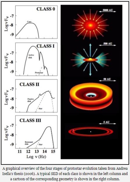 The condensation of these refractory minerals and the formation of calcium–aluminum-rich inclusions (CAIs) occurred episodically during the time interval between ~40 t.y. and ~160 t.y. after the beginning of the rapid infall stage (Pignatale et al., 2019 and references therein). CAI formation was further constrained by Pignatale et al. (2018) to within the first 80 t.y. of the molecular cloud collapse to account for CAI delivery to the outer CC region of the disk by viscous expansion. Conversely, modeling by Morbidelli et al. (2022) as well as Al–Mg dating of primitive, unmelted CAIs by MacPherson et al. (2012) limit the interval of CAI formation to ~20 t.y. or less; the later proposed timing likely reflects reprocessing of CAIs after formation. By analyzing only the Mo isotope variability in CAIs that is associated with the rapid neutron capture process of nucleosynthesis (r-process, quantified by Δ95Mo notation), Brennecka et al. (2020) determined that the timing of CAI formation corresponded to the Class I/II transition stage of protostellar evolution (see schematic diagram below). During this transition stage, infall from the molecular cloud evolved from a higher to lower abundance of r-process material (i.e., higher to lower Δ95Mo).