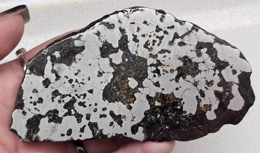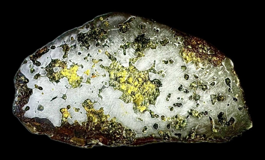 A 34.36 kg mass was found by M. and G. Farrell while planting in a grain field in Marshall County, Kansas, in the vicinity of the Black Vermillion River. The iron meteorite was purchased by a dealer with the belief that it was a Brenham mass, but upon cutting, it was discovered to be a unique pallasitic iron. The first analyses and classification of Vermillion was conducted by Boesenberg et al. and published in Meteoritics, vol. 30, #5, p. 488–489 (1995). They determined that Vermillion was a pyroxene pallasite genetically related to the only other pyroxene pallasite known at the time, Yamato 8451. The 2017 pyroxene pallasite find, Khatgal (3,520 g; photos [a, b] courtesy of Mark Lyon) is another potential genetic relative of Vermillion and Yamato 8451, having a similar Δ17O value and Ga/Ge ratio. However, Hsu et al. (2026 #1072) have argued that Khatgal may have originated in the CC reservoir, possibly associated with the IVB iron parent body; until further isotopic analyses are conducted, the source parent body of Khatgal remains in question.
