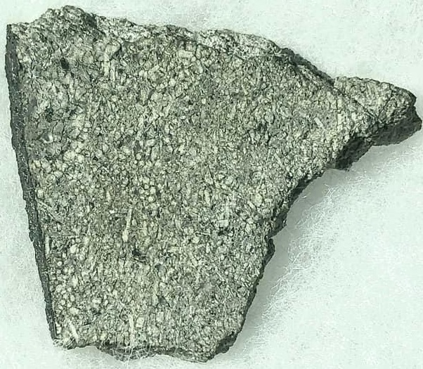Utilizing advanced techniques for matching craters to meteorite samples, Herd et al. (2024 #2044) determined that Zagami likely derives from the relatively young, nearly 14 km-diameter Corinto crater located in the Elysium volcanic region. An in-depth analysis of Corinto crater by Golombek et al. (2024 #2577) has determined that secondary craters measuring ≥10 m number between 1.3 and 3 billion. Based on data from the Infrared Mineralogical Mapping Spectrometer aboard the Mars Express orbiter, the best fits mineralogically are in the older volcanic terrains of the southern highlands including Syrtis Major, Thaumasia Planum, and Herperia Planum (Ody et al., 2013). The specimen shown above is a 21.0 g cut fragment of the coarse-grained component from the NZ (normal Zagami) lithology containing oriented pigeonite crystals and a segment of a black glassy shock-melt vein at the top edge.