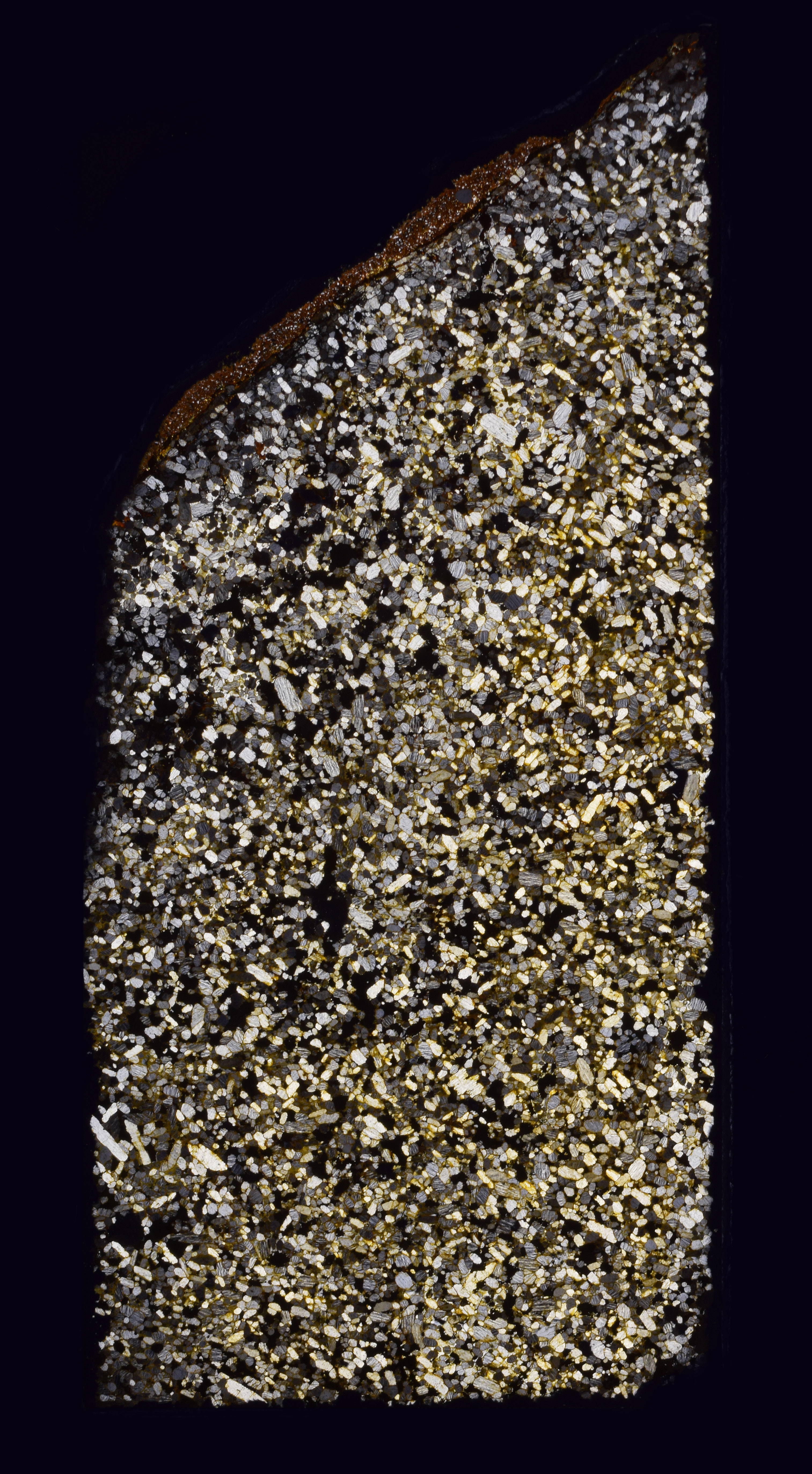 The specimen of Zakłodzie shown above is a 0.74 g partial slice showing a portion of a metal vein. The top photos below show a large mass of Zakłodzie presented courtesy of Marcin Cimala. The middle photo is a thumbnail image to a high-resolution photo shown courtesy of Tomek Jakubowski. The bottom photo is an excellent petrographic thin section micrograph of Zakłodzie shown courtesy of Peter Marmet.