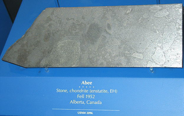 At 11:05 P.M., people in Alberta, Canada witnessed a fireball accompanied by detonations. Five days later, a single 107 kg stone was recovered from a hole approximately 1 m in diameter and 2 m deep in a wheat field near the town of Abee, 90 km north of Edmonton. On December 9, the meteorite was purchased from the finder, Harry Buryn, for $10/kg by the Geological Survey of Canada.