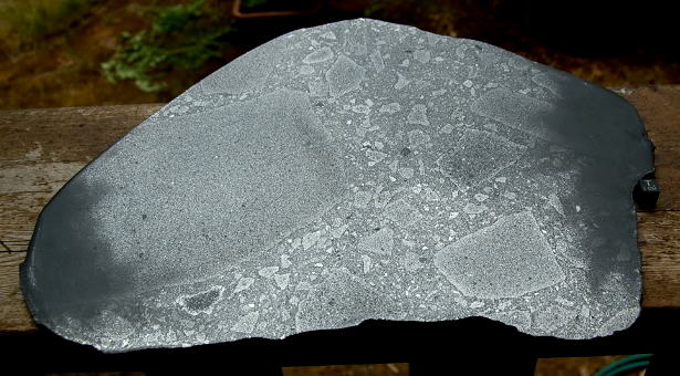 An unusual D-depleted, highly disordered, insoluble organic matter component was recovered in an acid residue of Abee, thought to be hosted by the late-stage accretion of dark inclusions (Remusata et al., 2012). The specimen of Abee shown above is a 4.9 g partial slice showing the brecciated nature of this meteorite, including a metallic-rimmed clast (bottom center) and a dark inclusion of unique enstatite chondritic material (upper right). A superb large slab of Abee can be seen on display at the Smithsonian Institution, Washington D.C. A complete slice measuring 374 × 260 × 7 mm and weighing 1,675 grams is in the collection of Edwin Thomson.