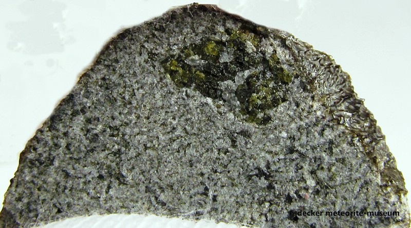 Special thanks to Siegfried Haberer and Stephan Decker for providing specimens of this special meteorite and many of its xenolithic inclusions to the scientific and collector communities. The photo of MS-MU-035 shown above is a 0.094 g (5 × 7 mm) crusted partial slice; the sample is courtesy of Stephan Decker. The top photo below is the complete mass of MS-MU-035 with a glassy fusion crust, while the bottom photos show gemmy olivines in the interior of the similar MS-MU-011. Excellent high-resolution photos of a 10.23 g specimen of AhS trachyandesite were presented by Vincent Haberer on the MPOD website for 29 July 2020.