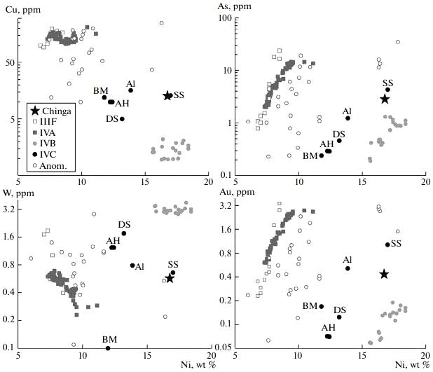 Importantly, Litasov et al. (2018) determined that Chinga shares compositional similarities with six other ungrouped irons: ALH 77255, Alikatnima, Babb's Mill (Blake's), Deep Springs, Onello, and Shingle Springs. In addition, they demonstrated that these seven irons plot between the IVA and IVB groups on all elemental diagrams utilized in their study, and therefore they propose that these irons be combined together into a new transitional subgroup termed IVC.