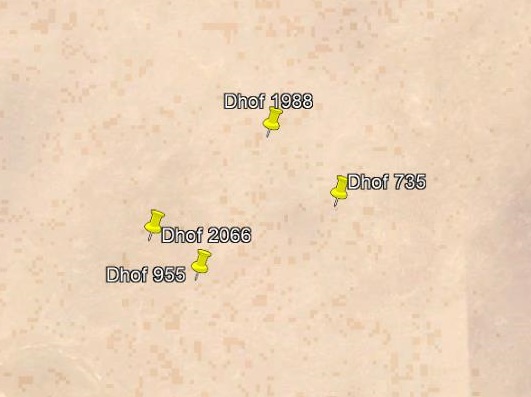 Dhof 735 (2002) 381 g: 19° 4.1' N, 54° 46.8' E Dhof 955 (2003) 16 g: 19° 3.3' N, 54° 45.2' E Dhof 2066 (2010) 13 g: 19° 3.728' N, 54° 44.665' E Dhof 1988 (2011) 59 g: 19° 4.865' N, 54° 46.026' E |
