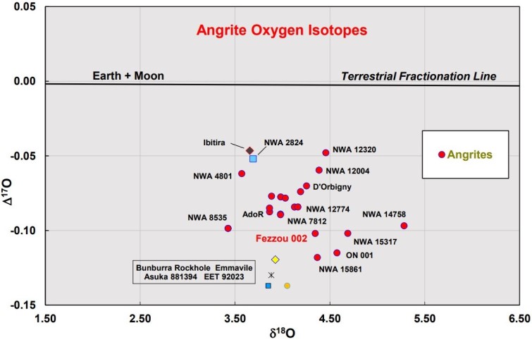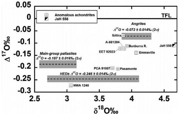 It is notable that Ibitira has Δ17O and ε54Cr values which are indistinguishable from the angrites (Franchi and Greenwood, 2004) (see diagram below). McKibbin et al. (2016) recognized that compositional similarities also exist between Ibitira and the angrites; e.g., both have relatively high refractory element contents (Ca, Al, and Ti) with depletions in alkali elements (Na and K). In addition, Ibitira has a relatively high heavy-REE content in contrast to the low heavy-REE content in xenocrystic olivine in angrites. Therefore, McKibbin et al. (2016) suggest that Ibitira might be the basaltic material complementary to the xenocrystic olivine in angrites. However, if Ibitira and the angrites derive from a common parent body the differences that exist in their respective Na/Ca and Fe/Mn ratios (D. W. Mittlefehldt, 2005) requires an explanation.