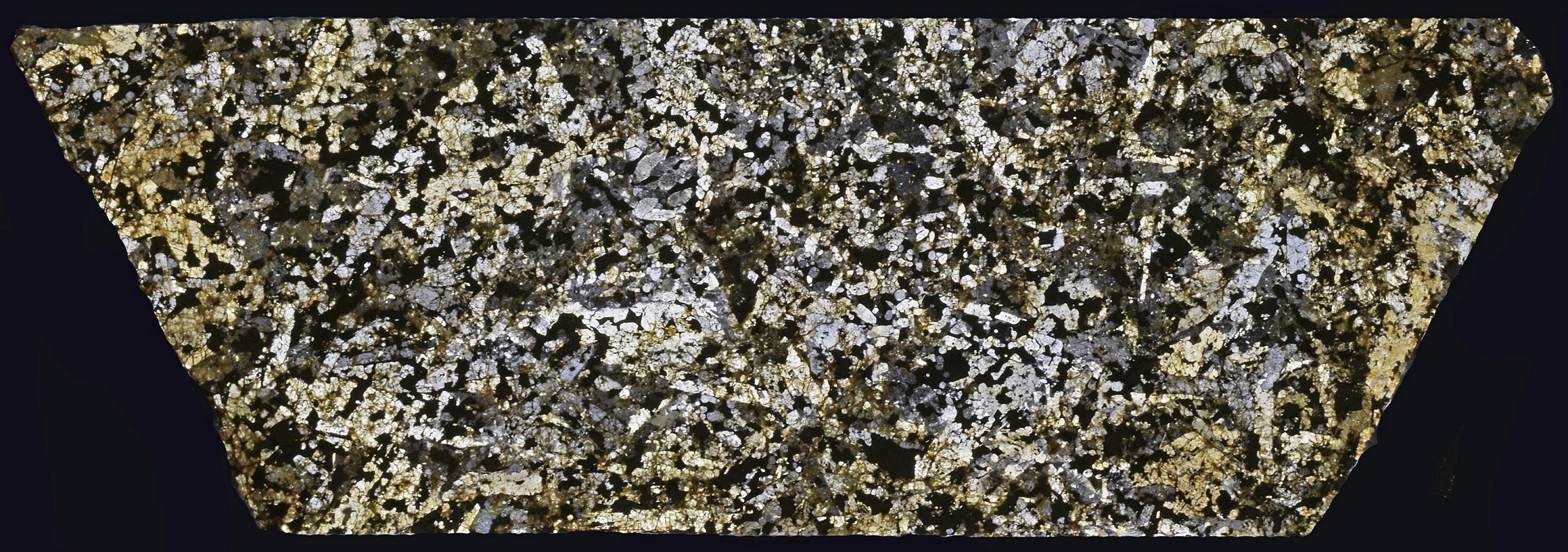 The specimen shown above is a 1.55 g partial slice of Ilafegh 009 that highlights the metallic component of this meteorite. It was originally part of a 25.5 g partial slice in the collection of JNMC–Zurich (see top photo below). The middle portion shown was utilized for further thin section studies; see bottom photo of a petrographic thin section micrograph of Ilafegh 009, shown courtesy of Peter Marmet.