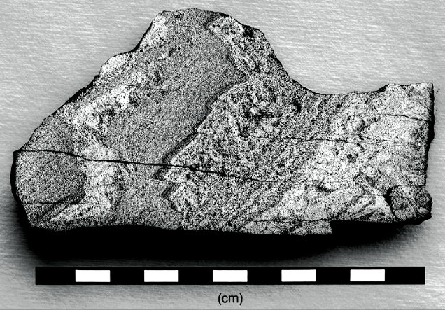 An investigation of these unique sedimentary laminations present in Isheyevo was conducted by Morris et al. (2015). They propose that Isheyevo represents a portion of a meters-thick layer from the surface of its parent body which re-accreted through a process of low-velocity sweep-up of aerodynamically size-sorted silicate and metal spheres following their condensation within an impact ejecta plume. They ascertained that the ejecta particles were slowed and size-sorted based on their respective compositions as they interacted with the primordial nebular gas. Their calculations constrain the timing of this event to the late-stage protoplanetary disk when the gas density was 10–11–10–12 g per cm–3, considered to be ~5 m.y. after CAIs as determined by isotopic dating. Based on assumptions derived from their studies, Morris et al. (2015) constructed a more detailed scenario for this event: sweep-up would have occurred ~70 hours after condensation of the particles (measured in days to weeks) while these particles were still within ~6,950 km of the asteroid as it moved through the plume at ~28 m/s (30–200 m/s; Garvie et al., 2017). An Isheyevo sample that was studied in-depth by Garvie et al. (2017) exhibits sedimentary laminations and features indicative of faulting and shearing due to compaction (see photo below).