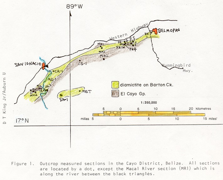 The K–Pg boundary site closest to the Chicxulub crater is located in the Orange Walk District in northern Belize, and it is the only known direct ejecta deposit, or fluidized debris flow (D.T. King Jr, 1996). The outcrop at Albion Quarry has a thickness of 16 m and contains material ranging in size from finely-ground host matrix to boulders 8 m in diameter which were ejected from the crater during impact. The stratigraphy of this quarry includes a 1–2 m basal Type 2 spherule-bearing layer in direct contact with the Maastrichtian Barton Creek Dolomite bedrock, which is overlain by an ~14-m-thick, poorly sorted diamictite layer comprised of several roughly graded beds. Pebble-sized red and green clay clasts within the diamictite layer are likely altered glass fragments (Ocampo et al., 1996). In the basal layer, the spherules exhibit increased flattening towards the bottom of the bed. Pope and Ocampo (2000) described large, sub-rounded, extremely fine-grained limestone fragments (~4–23 cm in diameter) known as Pook's pebbles found at Pook's Hill in western Cayo District. These pebbles exhibit several features indicative of sub-orbital flight and ablation during atmospheric re-entry, including regmaglypts, impact and ablative pits, parallel gouges and striations, rounded facets, and thin, translucent, relict fusion crust (often truncated and located opposite a heavily pitted side, indicative of orientation); these pebbles are analogous to terrestrial meteorites (see photo below). Although to date no impact glass or shocked grains have been found at the western Cayo District site, Pope et al. (2005) did describe impact ejecta material such as spherules, altered glass shards, and shocked quartz from an outcrop at Armenia in the eastern Cayo District; notably, Armenia and Pook's Hill are equidistant from the crater, and therefore it could be inferred that both locations should contain similar deposits from the ejecta curtain and/or impact vapor plume.