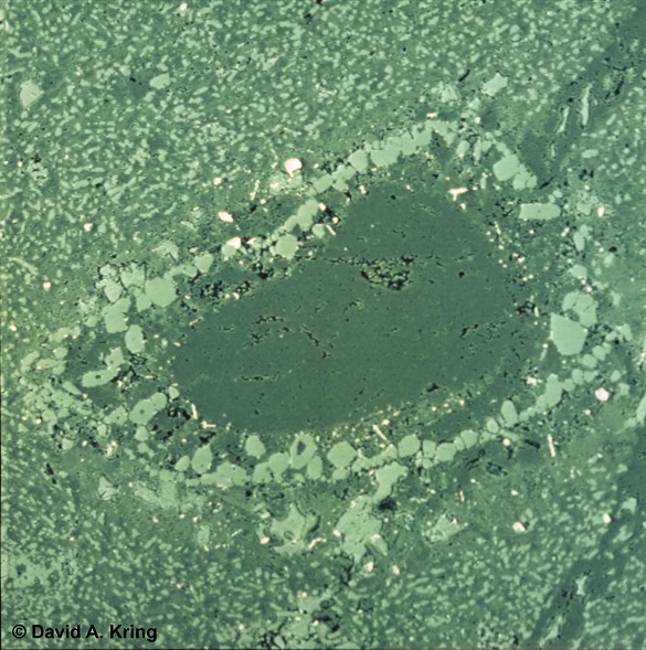 This impact produced lithologies such as polymict impact breccia and impact melt rock which were discovered in borehole samples obtained from the interior of the Chicxulub crater (David A. Kring, LPI, 'Chicxilub Impact Event'). The impact event is associated with shocked quartz with planar deformation features, as well as impact-generated melt products in the form of sub-mm- to mm-scale glass spherules (microtektites) and irregularly- to aerodynamically-shaped glass shards and fragments, all embedded in an iridium-enriched astrostratigraphic unit identified at various locations around the world (e.g., Hildebrand and Boynton, 1990; Kring and Boynton, 1991). In addition, cubic nanodiamonds have been identified by investigators in North American K–Pg boundary layers, while Bunch et al. (2008) identified shock-produced hexagonal nanodiamonds (lonsdaleite) in K–Pg boundary layers at Needles Point, New Zealand and Caravaca, Spain. Lonsdaleite is formed as carbonaceous material is subjected to extreme pressure (>15 GPa) and temperature (>1000°C).