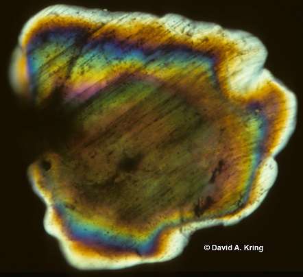 It was determined the black goethite spherules are a product of primary olivine replacement under aqueous conditions. They contain very high abundances of refractory lithophile and siderophile elements consistent with early fractional condensation from a high-temperature region of the vapor plume. Belza et al. (2017) observed that these spherules preserve relict crystal textures analogous to several meteorite chondrule types, including porphyritic, radial/barred, relict/granular, skeletal, and barred. They concluded that the specific texture of the spherules was controlled by peak temperature, heating duration, cooling rate, and degree of undercooling, the latter related to the availability of nucleation sites within melt droplets as influenced by unmelted precursor grains or variable concentrations of dust in the vapor plume.