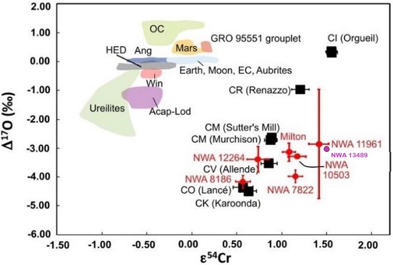 Importantly, Cuppone et al. (2024 #6029) noted that NWA 13489 plots on the same O-isotope trend line as several other ungrouped CC meteorites formerly recognized by Irving et al. (2019 #2542), who gave it the unofficial name 'CX trend' (see first diagram below). In addition to having a similar O-isotopic trend, NWA 13489 and NWA 11961 have identical (within error) ε54Cr values of +1.50, which indicates they likely have a genetic connection. At the same time, 54Cr isotope data obtained for several other meteorites have resolved both NWA 11961 and NWA 12264 as two potentially new carbonaceous parent bodies, and suggest that the parent body of NWA 13489 and NWA 11961 may be distinct from that of NWA 10503 and Milton, the latter two previously considered possible members of the CV-clan (see second diagram below). However, further in-depth analyses of NWA 13489 conducted by Cuppone et al. (2025) has led them to revisit whether a genetic relationship exists between all four meteorites—NWA 13489, NWA 11961, NWA 10503/10859, and Milton—and based on many factors, they now consider such a relationship to be plausible (see third diagram below).