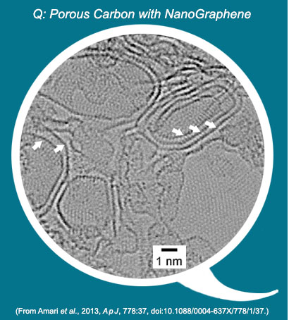 A unique dark inclusion (DI) was discovered in Ningqiang which represents some of the most pristine nebular material ever studied (Zolensky et al., 2003). It comprises two lithologies, both of which consist of µm-sized olivine and pyroxene crystals, but in only one are the silicates rimmed by amorphous to microcrystalline material. These rims are thought to have formed through irradiation by bipolar outflows or FU-orionis flares from the nascent Sun, and in fact, this rim material is the carrier for Ar-rich, heavy primordial noble gases that were produced in a plasma (Nakamura et al., 2003). In addition, an amorphous carbon phase in this DI contains both the dominant 'Q' (for 'quintessence') and exotic 'HL' (enriched in both heavy and light isotopes) primordial noble gases. This porous carbonaceous host phase for the Q-gases has been characterized by Amari et al. (2013) as nanoscale graphene platelets (see photo below). An in-depth investigation into the carbonaceous carrier of the Q-phase was conducted by Fisenko et al. (2018) utilizing the L4 chondrite Saratov. They contend that the carrier of the Q-gases is a nongraphitizing carbon phase present as curved, few-layer, graphene-like sheets which were likely formed in the protoplanetary nebula. The DI in the Ningqiang chondrite must have been incorporated after parent body aqueous alteration processes were complete and subsequent to partial annealing, because noble gases would have been quickly lost from host minerals through such oxidizing alteration processes (Yamamoto et al., 2006).