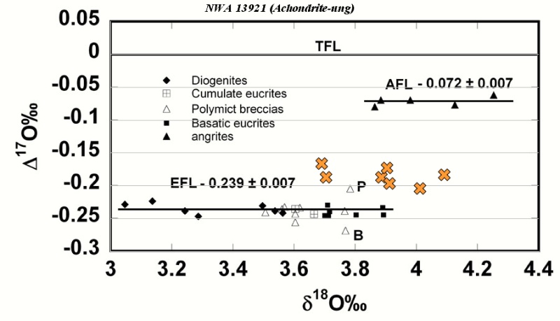 An oxygen isotope analysis conducted at the University of New Mexico (K. Ziegler) shows that NWA 13921 plots closer to the TFL compared to typical diogenites and eucrites. Its O-isotopic composition overlaps with that of the anomalous eucrites Pasamonte, Moama, and ALHA78132 (see diagrams below).