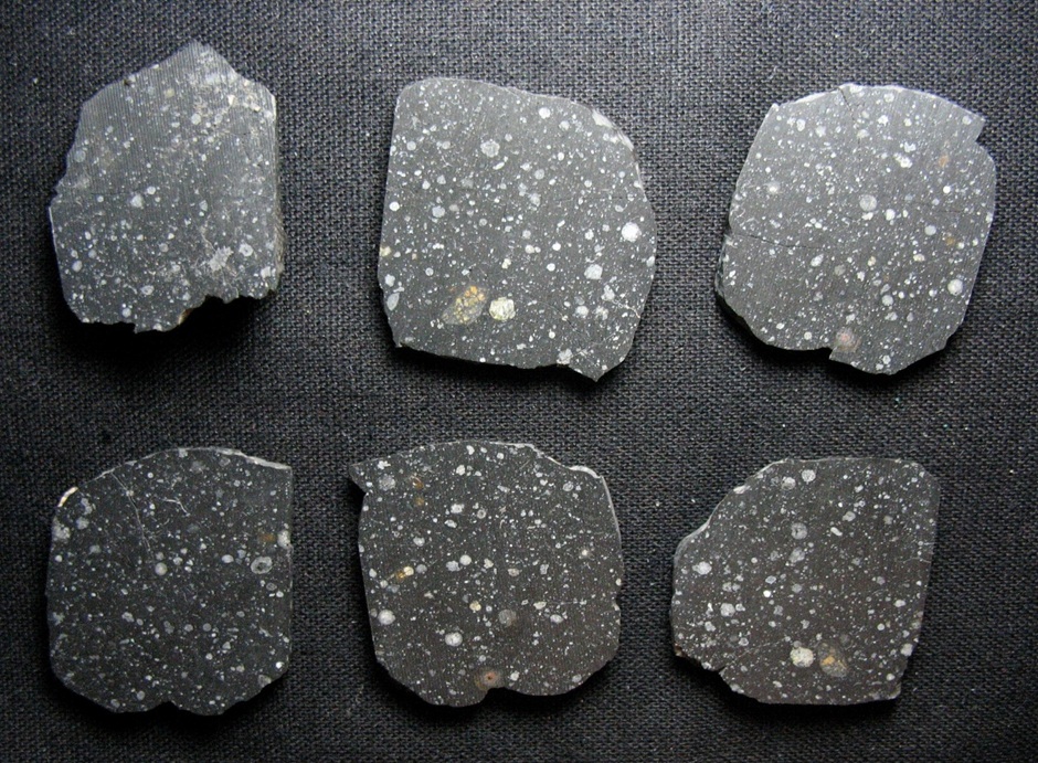 The photo of NWA 16000 shown above is a 3.05 g slice, shown courtesy of F. Kuntz. The meteorite exhibits the typical features of this unique carbonaceous chondrite as demonstrated in the photo of multiple slices below.