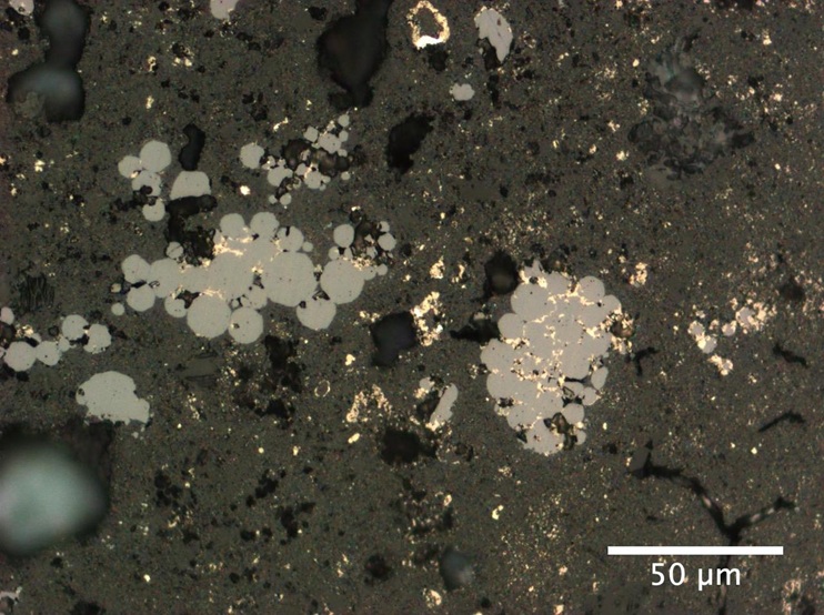 The relatively fresh meteorite is composed of distinct, unequilibrated chondrules (olivine Fa0.9–62.9 mol%) measuring 390 (±240) µm, embedded together with CAIs (up to 100 µm) in a fine-grained matrix constituting ~81 vol%. Other phases present include sulfides, rare metal, and framboidal-like magnetite clusters (see image), the latter perhaps similar to framboidal pseudo-magnetite (wüstite) identified in a Ryugu sample by Kimura et al. (2022); notably, no phyllosilicates or other hydrous phases were identified in the NWA 16000 analysis. An oxygen isotope analysis shows that NWA 16000 plots with Ryugu samples and CI chondrites (see diagram below).