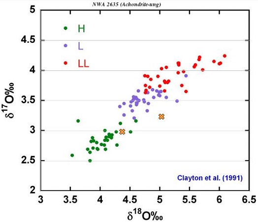 Based on the completed O-isotope analyses, it is evident that the ratios plot on an oxygen three-isotope diagram slightly outside of the main field of H chondrites while still overlapping the fields that resolve the H chondrite–IIE iron parent body. Further studies will be needed to examine the possibility that the O-isotope ratios might have been shifted due to open system aqueous flows on the H chondrite parent body. Given that NWA 2635 is a recrystallized, texturally evolved chondrite with elemental ratios and an O-isotopic composition showing affinities to the H chondrite group, it is appropriately assigned to the newly proposed group of metachondrites (Irving et al., 2005).