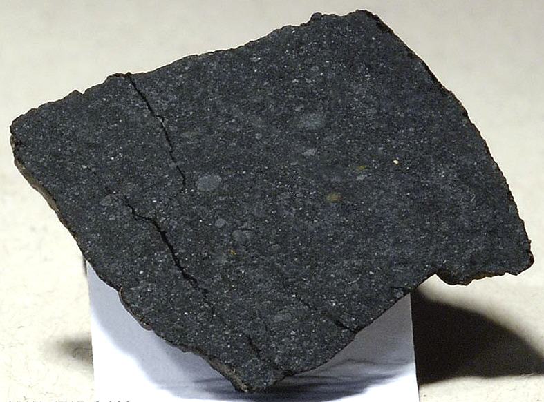 Based on reflectance spectra in the range of 0.4 to 2.4 μm captured by the OSIRIS-REx spacecraft, as well as utilizing meteorite analogs, it has been speculated that asteroid (101955) 1999 RQ36 is composed of CM1-like material. Further details of the formation of CM chondrites can be found on the Murchison page. The specimen of NWA 4765 shown above is a 0.8 g partial slice. A photo of the main mass is shown below.