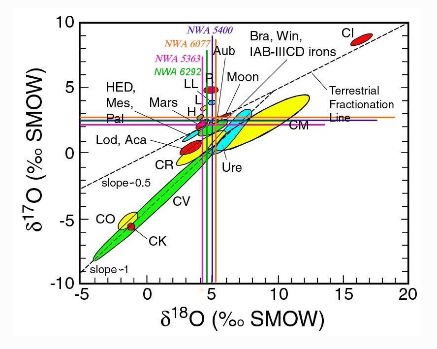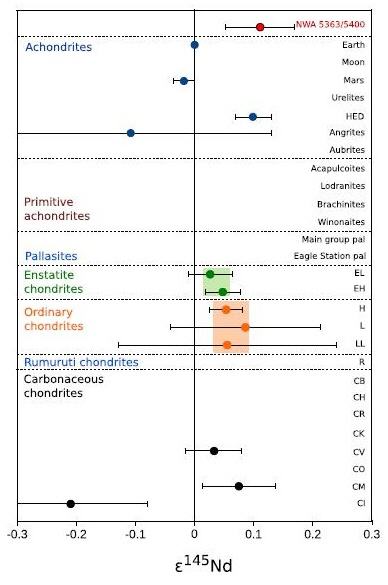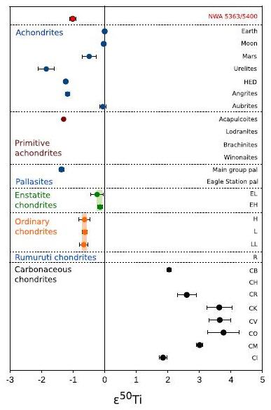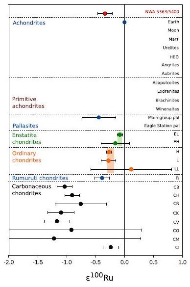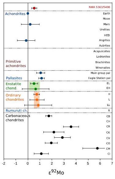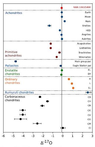 Burkhardt et al. (2015, 2017 [http://dx.doi.org/10.1111/maps.12834]) have conducted in-depth petrographic, geochemical, and isotopic (O, Cr, Ca, Ti, Ni, Mo, Ru and Nd) analyses for the paired meteorites NWA 5363 and 5400. Results of their studies indicate that while NWA 5363/5400 has Δ17O values indistinguishable from Earth, other isotopic anomalies (ε54Cr, ε48Ca, ε50Ti, ε92Ni, ε92Mo, ε100Ru, ε145Nd) show significant differences from the Earth. The isotopic anomalies together with the chronological and petrographic data demonstrate that this meteorite does not represent precursor material of Earth, early impact ejecta from Earth, or remnants from 'Theia'. Instead, Burkhardt et al. (2017) concluded that its parent body was a relatively small asteroid that originated in a unique nebula isotopic reservoir most similar to enstatite and ordinary chondrites, and that it experienced a petrogenetic history similar to brachinites. It is interesting to note that, with the exception of ε48Ca (no angrite data for ε100Ru), NWA 5363/5400 and angrites have values for each of these isotopic anomalies that are nearly the same or overlap within uncertainties. In another study, Amelin and Irving (2011) proposed that NWA 5400 originated from a parent body associated with one of the iron meteorite groups containing primitive Pb.