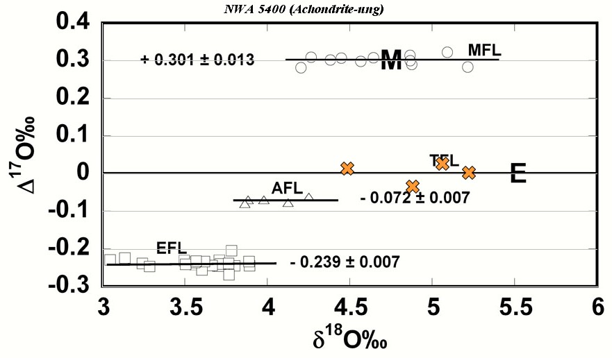 The four recognized members of the NWA 5400 pairing group are plotted on two different oxygen three-isotope diagrams: (1) (courtesy of Bernd Pauli) and (2) (courtesy of Achim Raphael). The first diagram utilizes a less precise slope for the TFL (Terrestrial Fractionation Line) of ~0.5. Recent O-isotopic studies conducted by the Carnegie Institute, the Open University, and the University of Groningen have determined that a slope of 0.526 represents a more precise TFL slope (Rumble III et al., 2007). When constructed with updated coordinates (A. Irving), the adjusted TFL slope passes very close to the points determined for the NWA 5400 pairing group. The slope also passes through the CI chondrite field and probably the martian field as well. The second diagram compares the NWA 5400 pairing group to the brachinites and brachinite-like meteorites Divnoe, Zag (b), and NWA 4042. It is apparent that the NWA 5400 pairing group is not genetically related to either the brachinites or the brachinite-like meteorites, but probably formed by analogous processes (e.g., similar oxygen fugacity; Lenaz and Schmitz, 2017) on separate parent bodies. See also a linearized O-isotope plot showing a slope similar to the TFL, based on data from Miller (2002).