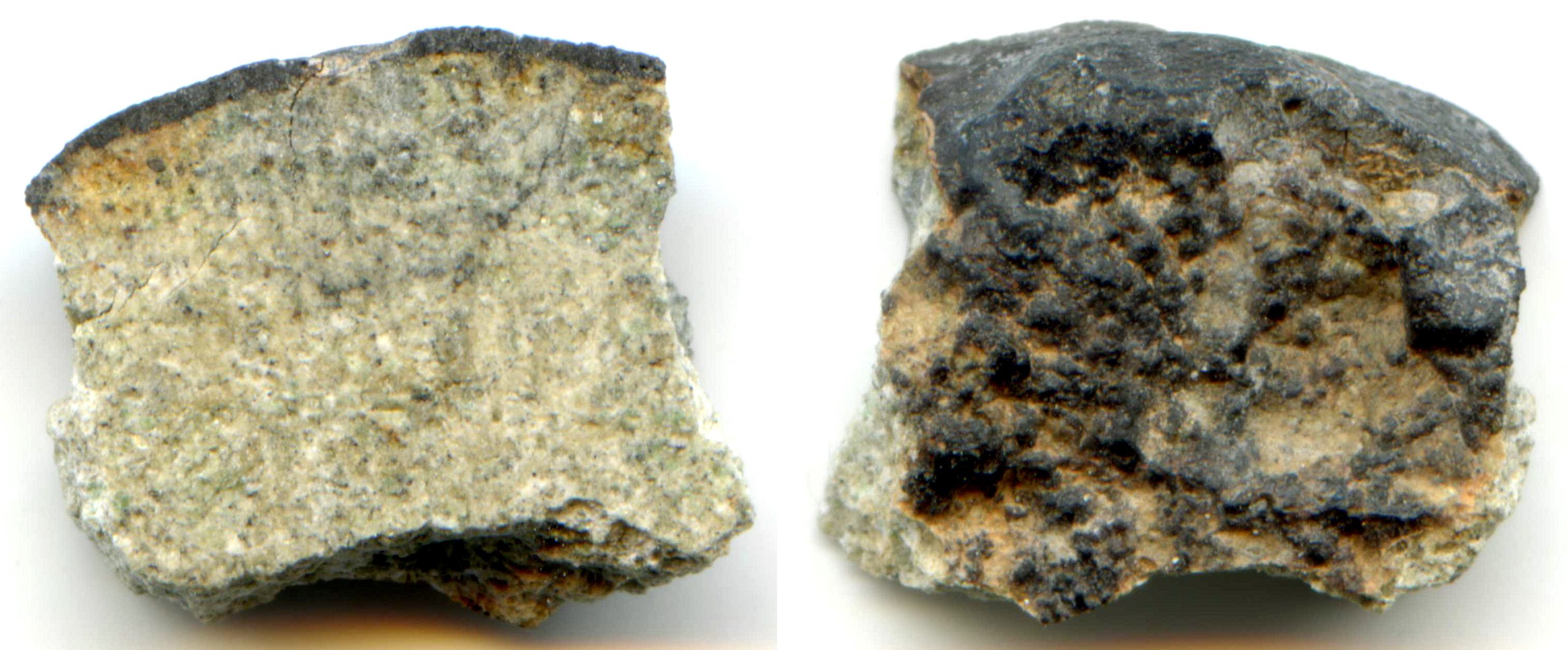 The specimen of NWA 7030 shown above is a 0.77 g end section. The top photo below shows the fresh fusion-crusted mass, while the bottom photo shows the interior of a 15.62 g slice with both lithologies—photos courtesy of Greg Hupé.