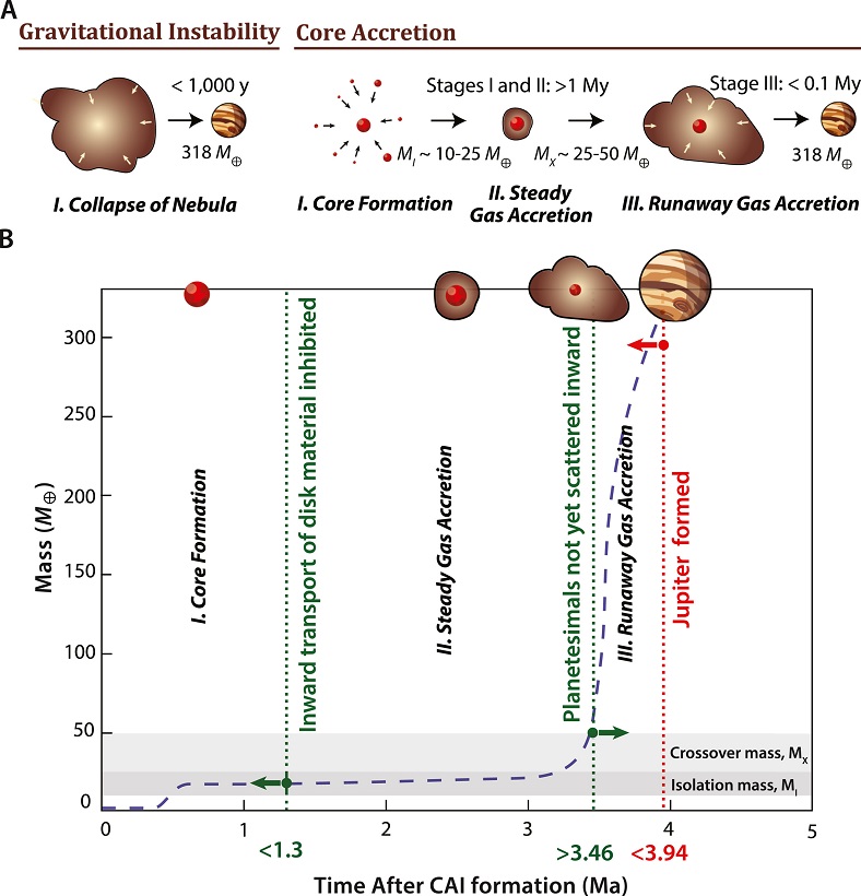 Additional constraints on the timing of the growth of Jupiter were provided by Weiss and Bottke (2021) based on isotopic and paleomagnetic data. They determined that the core accretion model rather than the gravitational instability model is most consistent with both their data and observations by the Atacama Large Millimeter/submillimeter Array (ALMA) (see diagram A below).