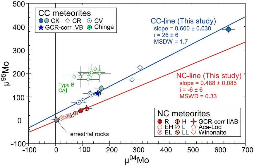 The Mo-isotopic dichotomy that exists between the CC and NC meteorites was also investigated by Yokoyama et al. (2019) employing an extremely precise measurement technique. Their study included ten irons (IIAB [4], IVB [4], IVB-like, IIE-like), two carbonaceous chondrites (CK4, CK5), five ordinary chondrites (H4, H5, LL5 [2], LL6), and two rumuruti chondrites (R3.9, R4). While the previous study by Budde et al. (2019) utilized a broader sampling of meteorite groups for their revision of the 95Mo–94Mo isotope diagram after Kruijer et al. (2017), the new study by Yokoyama et al. (2019) used improved values for irons that are corrected for neutron-capture modification due to galactic cosmic ray (GCR) exposure during prolonged transit times in space. Based on these more accurate values for iron meteorites, along with new values for other meteorite groups combined with recent literature data (e.g., Kruijer et al., 2017; Budde et al., 2019), they derived new slopes and intercepts for the coupled Mo isotope diagram as shown below.