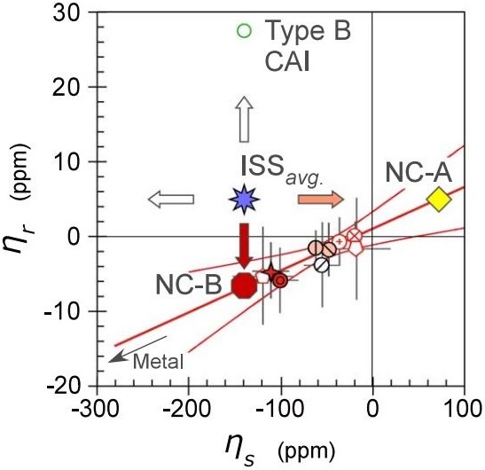 The new slope derived by Yokoyama et al. (2019) for the CC meteorites is consistent with that obtained in previous studies, with the Mo-isotopic variability among samples being attributed either to differences in the abundances of s-process-enriched presolar grains or to parent body processing (e.g., oxidation, thermal metamorphism). The new slope derived for the NC meteorites can be explained by the existence of two end-member components, NC-A and NC-B, which are resolved from each other by variations in s-process and r-process Mo isotope depletions. The NC-B component is represented most closely by the R chondrite and ACA–LOD groups, which exhibit the highest depletion in r-process Mo with no depletion in s-process Mo. Yokoyama et al. (2019) posit that the NC-B component could be a residual fine-grained phase that is isotopically complementary to the the type B CAI nebular reservoir, as established by a thermally-induced destruction of an r-process-rich carrier in the early protoplanetary disk (see schematic diagram by Yokoyama et al., 2019). Thereafter, the NC-A component was formed either by 1) another thermal processing event that destroyed an s-process-depleted carrier phase, or 2) the removal of a metal component from (thus increasing the ηs and ηr values), or the addition of a matrtix component to (thus decreasing the ηs and ηr values) an initial NC-B-like reservoir (see schematic illustration below).