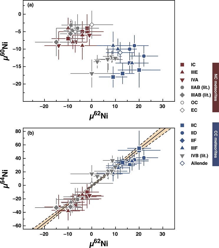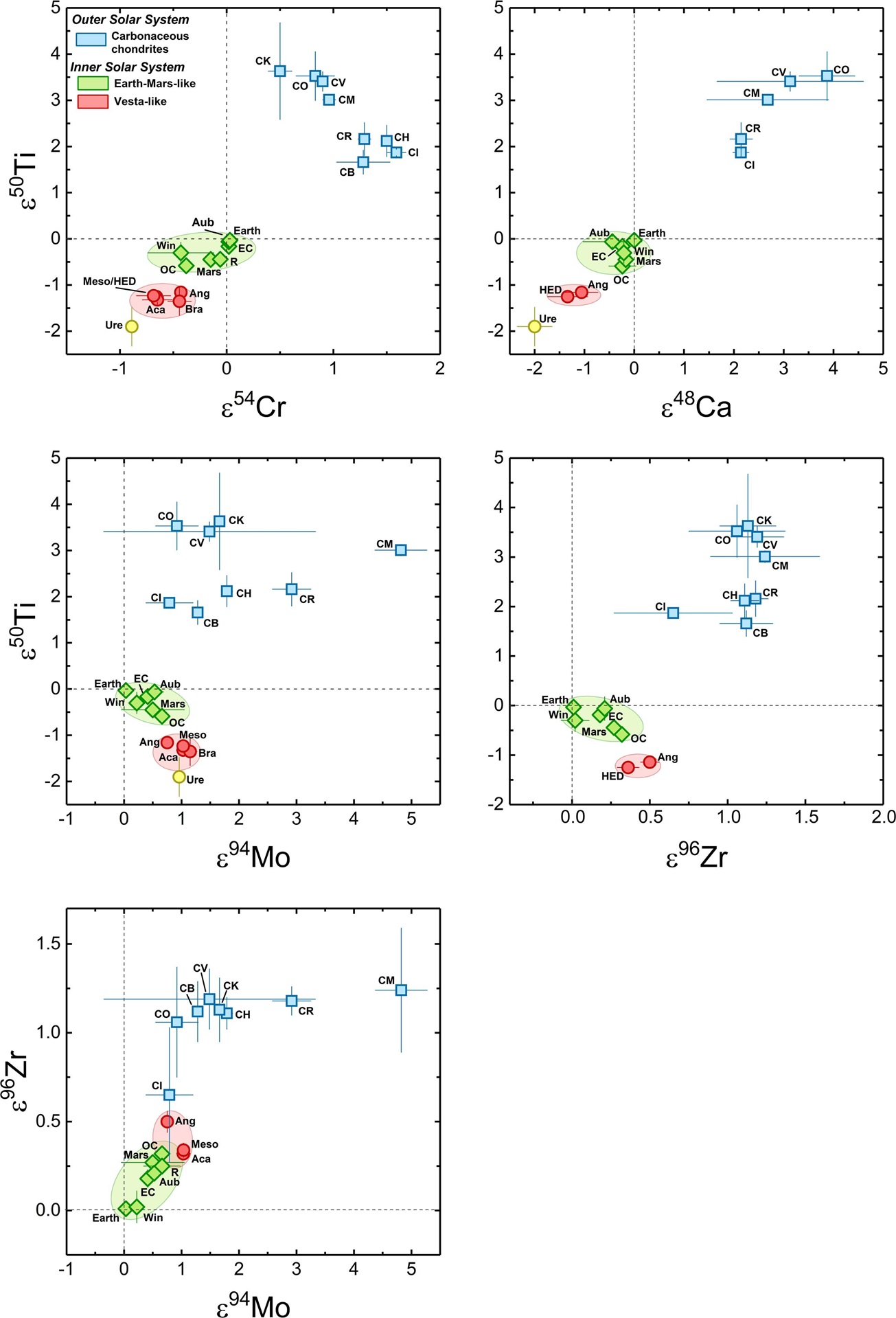 In a related study, Nanne et al. (2019) analyzed the Ni isotopes in irons from several CC-region chemical groups and found an ~60 ppm 58Ni excess for these irons compared to those from the NC-region chemical groups (see top diagrams below). They also assert that the NC–CC dichotomy reflects the late infall to the inner protoplanetary disk of material depleted in supernova-derived nuclides such as 54Cr, 50Ti, 58Ni, and r-process Mo at a time when the Jupiter gap prevented efficient exchange between the two isotopically-distinct disk regions. Thus, the present CC region in the outer protoplanetary disk preserves for the most part the initial disk isotopic composition that was established through an enrichment in supernova-derived nuclides, which were hosted by the earliest formed nebular solids—CAIs.
