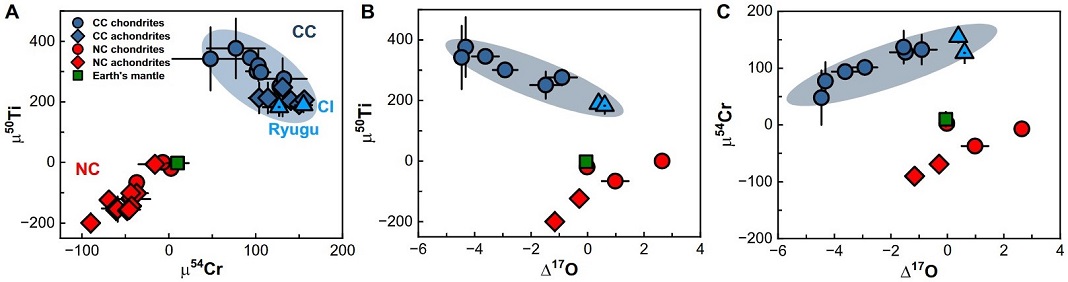 Hopp et al. (2022) investigated the comparative nucleosynthetic anomalous isotopes (O, Cr, Ti, Fe) of CI chondrites and samples of the Cb-type asteroid Ryugu returned by the JAXA Hayabusa2 mission. They found that the µ54Fe values of both CI chondrites and Ryugu samples are distinct from those of either NC or CC meteorites, indicating the existence of a third isotopic reservoir in the outer protoplanetary disk and thereby defining a trichotomy (see diagrams below). They suggest that CI chondrites and Ryugu originally formed in this distant reservoir and may even represent a common precursor body that experienced fragmentation after its implantation into the inner Main Belt. Previously, computer modeling by Fernández and Ip (1981) demonstrated that close planetary encounters with Uranus and Neptune would have dispersed such cometesimals both outward into the cometary reservoir (Oort cloud) and inward into the inner Main Belt.