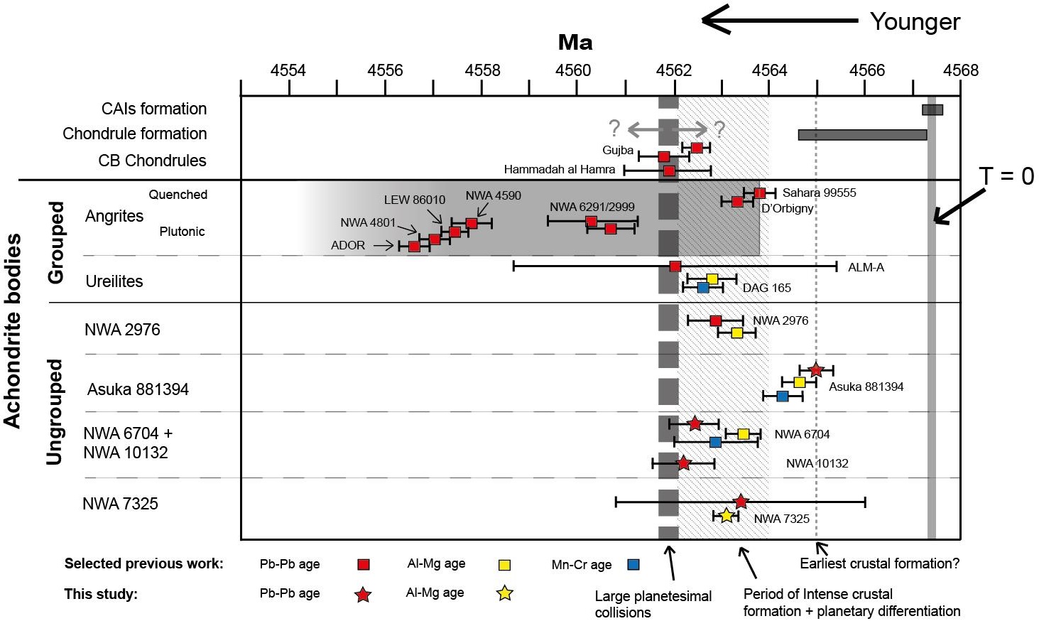Improvements in the early chronology of the Solar System were presented by P. Koefoed (2017) based on more precise U–Pb data for the meteorites NWA 6704, NWA 10132, NWA 7325, and A-881394. The formation of crustal material of these planetesimals can be dated to as early as ~2 m.y. after CAIs, indicating that accretion of planetesimals was occurring contemporaneously with CAI formation.