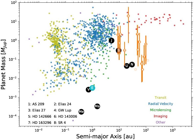 Insights into the earliest stages of planetary accretion can also be made through studies of nearby protoplanetary disks. The Disk Substructures at High Angular Resolution Project (DSHARP) survey was instituted to characterize the substructures of a select group of 20 protoplanetary disks associated with young stars (Andrews et al., 2018). These stars have median ages of ~1 m.y., with some as young as a few hundred thousand years, and they have masses of ~0.2–2 M⊕. Utilizing the very high resolution data (spatial resolution of ~5 AU) from the Atacama Large Millimeter/submillimeter Array (ALMA) radio telescope, the team investigated small-scale disk features, including concentric bright rings, dark gaps, spiral patterns, and asymmetries (e.g., crescent/arc structures [vortex scenario of Pérez et al., 2018]; Isella et al., 2018), which are associated with the earliest stages of planet formation. The rings are likely formed through dust trapping at the outer edge of a pressure bump produced by one or more embedded planets (Dullemond et al., 2018; Guzmán et al., 2018; Bodénan et al., 2021 #1954). In-depth analyses of the disk features enabled the identification of potential planets with Neptune- to Jupiter-scale masses (Zhang et al., 2018; see diagram below).