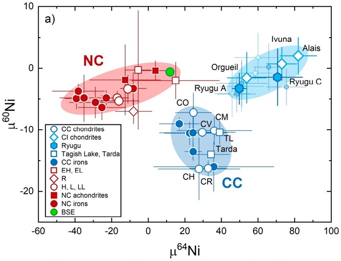 Spitzer et al. (2025) obtained Fe and Ni isotopic data for 27 ungrouped CC-type iron meteorites, 4 ungrouped CC-type achondrites, and 5 established iron groups (IIC, IIF, IIIE, IIIF, and IVB). Using both µ54Fe vs. µ64Ni and µ60Ni vs. µ64Ni coupled diagrams, they demonstrated that Ryugu and CI chondrites plot in a unique space compared to all other CC- and NC-type meteorites. They also found that no CI chondrites experienced a differentiation process, which they attribute to late formation after dissipation of the nebular gas. In addition, they demonstrated that CR-related meteorites constitute a genetic cluster distinct from Ryugu/CI chondrites and other CC-type meteorites based on Fe–Ni isotopic compositions, thus establishing three statistically significant CC-type clusters (see diagram below). Notably, all CR-related meteorites (e.g., chondrites, achondrites, and irons) derive from an early, isolated and sustained reservoir, and represent those CC planetesimals which are the most dissimilar to CI chondrites.