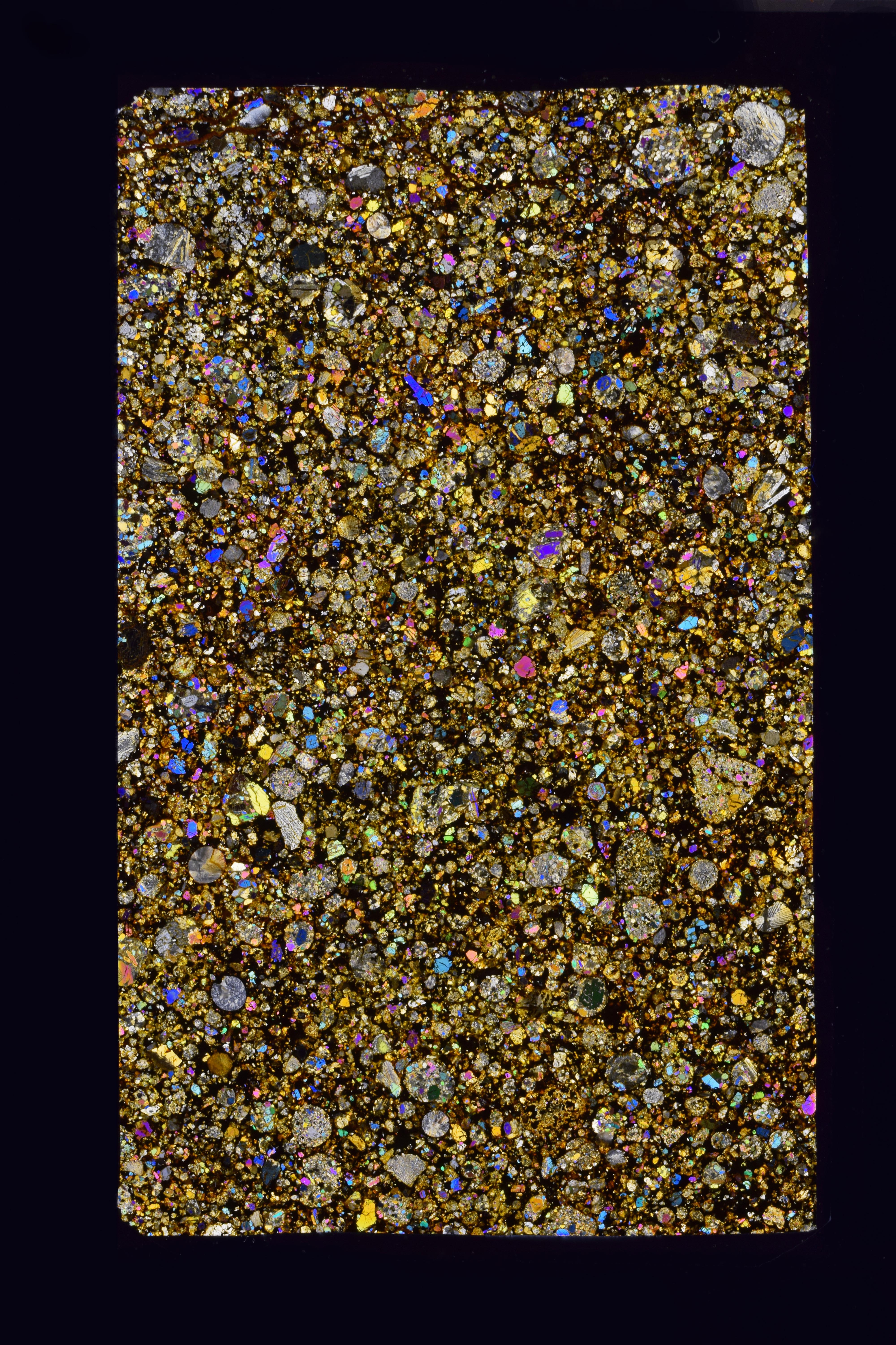Quoting a letter from Chester A. Reed to Walter M. Jackson dated February 25, 1935: "Our records also show that the Selma specimen was offered to the Museum by Mr. Coleman, June 29, 1906, sent on approval October 6, 1906, and that final payment was made January 29, 1907." Selma has a very high total iron content of over 22%, and its chondrules are extremely variable with a high degree of fragmentation. Several interesting thin section photos from the Selma meteorite are presented and described by John Kashuba in the September 2014 Meteorite Times Magazine, and an excellent petrographic thin section micrograph of Selma is shown below courtesy of Peter Marmet. The specimen of Selma shown above is a 21.6 g partial slice.