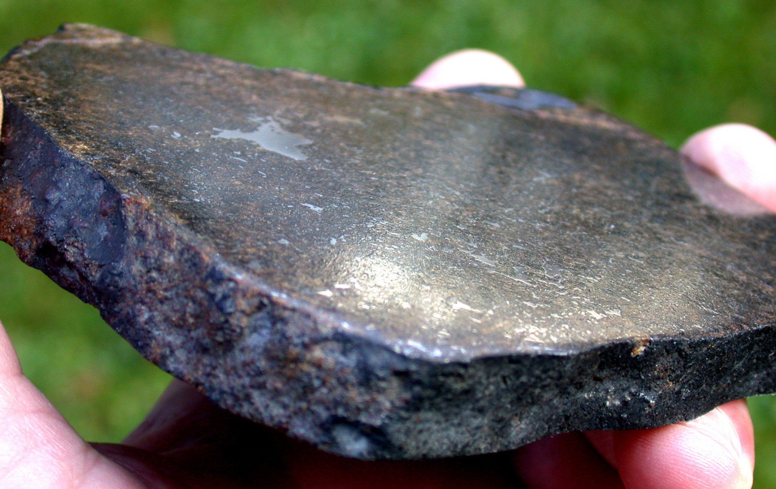 Te-1 was reported to have a CRE age of ~45 m.y., although the CRE age ascertained for Tafassasset is ~76 m.y. See the Tafassasset page for updated information about this meteorite. The specimen shown above is a 1.72 g partial slice with fresh fusion crust on one end, acquired in 2001 from Norbert Classen. The top photo below shows the main mass of Te-1 with an end slice removed. At the bottom are two different lighting angles for a thick slab of Te-1, shown courtesy of Stephan Kambach.