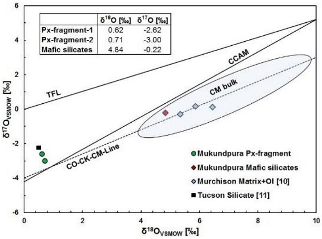 A sub-mm-sized xenolithic achondrite clast from the CM chondrite Mukundpura was analyzed by Ebert et al. (2018). The clast has an O-isotopic composition and a REE pattern with HREE enrichment similar to silicate inclusions in the Tucson iron, and it is considered that they might share a common parent body (see diagram below).